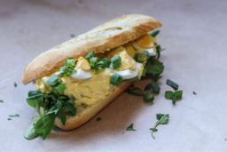 Broodje met romige eisalade, aspergestukken, plakjes zalm, frisse lente-ui en knapperige sla.