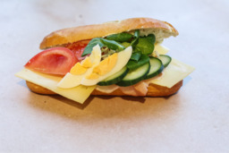 Broodje gezond met ham, kaas, ei, komkommer, tomaat en frisse rauwkost.