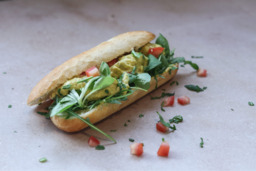 Broodje kipkerrie met superieure kipkerriesalade en frisse sla.