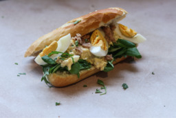 Broodje tonijnsalade met ei‑bieslooksalade, tonijn, gekookte eieren en frisse lente-ui.